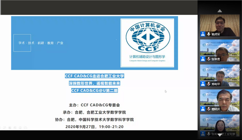 2020年9月27日晚上19:00,“深探数形世界,遥视智能未来”暨CCF CAD&CG走进bwin必赢线路检测研讨会在我校召开。本次研讨会以bilibili直播平台+腾讯会议的形式开展。国家杰青获得者、长江学者浙江大学鲍虎军教授,莫纳什大学数据科学与人工智能系主任蔡剑飞教授,国家杰青获得者中国科学技术大学刘利刚教授等三位活跃在计算机与数学交叉领域的学者应邀联袂为我校师生带来精彩的学术报告。bwin必赢线路检测刘晓平教授、檀结庆教授、郑利平教授为本次会议的特邀嘉宾兼主持人。