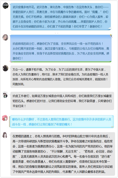 刘鹏伟同学说:“‘仁心者,志愿者,逆行者,者者共生;温暖生,希望生,奇迹生,生生不息。’你们犹如黎明破晓时那束点燃黑暗的曙光,冲破黑暗;你们用一颗颗医者仁心,温暖了整个武汉;你们凝聚了十四亿中国人面对困难时坚韧不拔的毅力。我相信,爱和温暖,总比病毒蔓延的更快;我相信,信念和勇气,终能拨开笼罩荆楚大地的阴云。”
