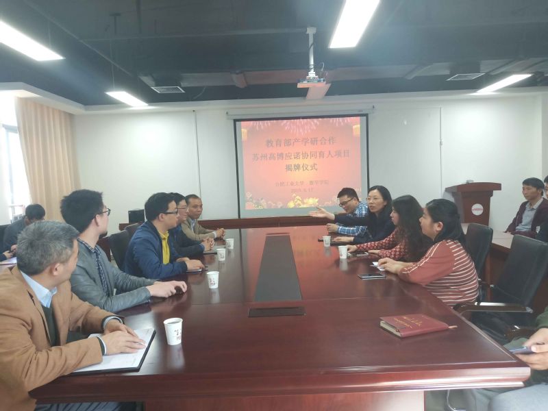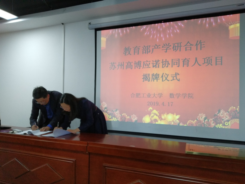 4月17日下午,教育部产学研合作协同育人项目揭牌仪式在翡翠湖校区科教楼B座1710成功举行。会议由我院张莉副院长主持,王青山副院长,殷明教授,凌能祥教授,焦贤发教授,3个专业系部的主任,教师代表,10多名同学代表,以及苏州高博应诺信息科技有限公司总经理于强参加了揭牌仪式。