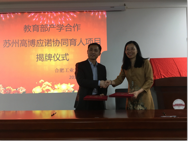 4月11日下午,苏州高博应诺信息科技有限公司总经理周世峰一行带着教育部高等教育司颁发的产学合作协同育人项目牌匾来到我院举行揭牌仪式.我院张莉副院长, 王青山副院长, 殷明教授, 3个专业系部的主任以及20多名同学代表参加了揭牌仪式.