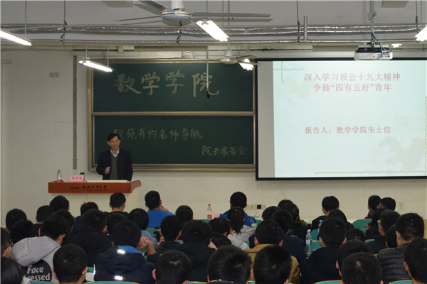 12月7日晚,437ccm必赢国际版于翡翠湖校区五教103开展了十九大精神宣讲报告暨“数苑有约——名师导航”院长报告会暨“燃点创新之花,砥砺思辩精神”主题博睿沙龙,437ccm必赢国际版院长朱士信分别作了题为《深入学习领会十九大精神,争做四有五好青年》《大学生数学学习和成长》的报告,学院2017级全体同学聆听了报告会。