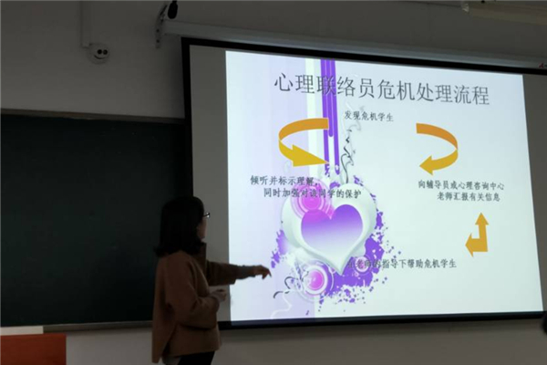 辅导员任颖首先结合案例从心理危机的常识、识别和应对等方面进行了深入浅出的讲解,使同学们初步掌握了发现心理异常情况并快速做出反应的方法,同时介绍了心理联络员的工作职责、工作内容、工作原则、评优办法等内容,使同学们更加明确了自己肩负的责任。