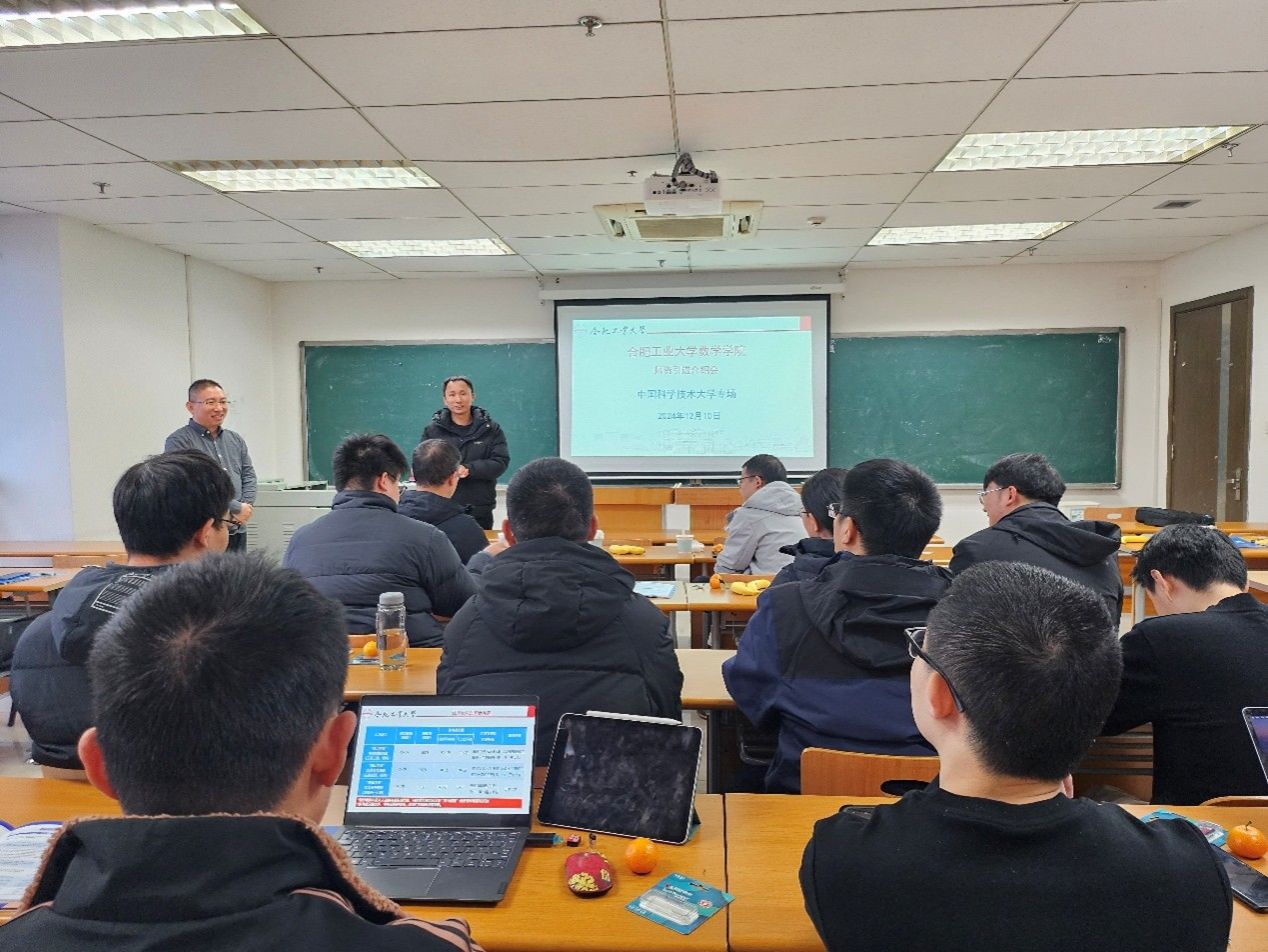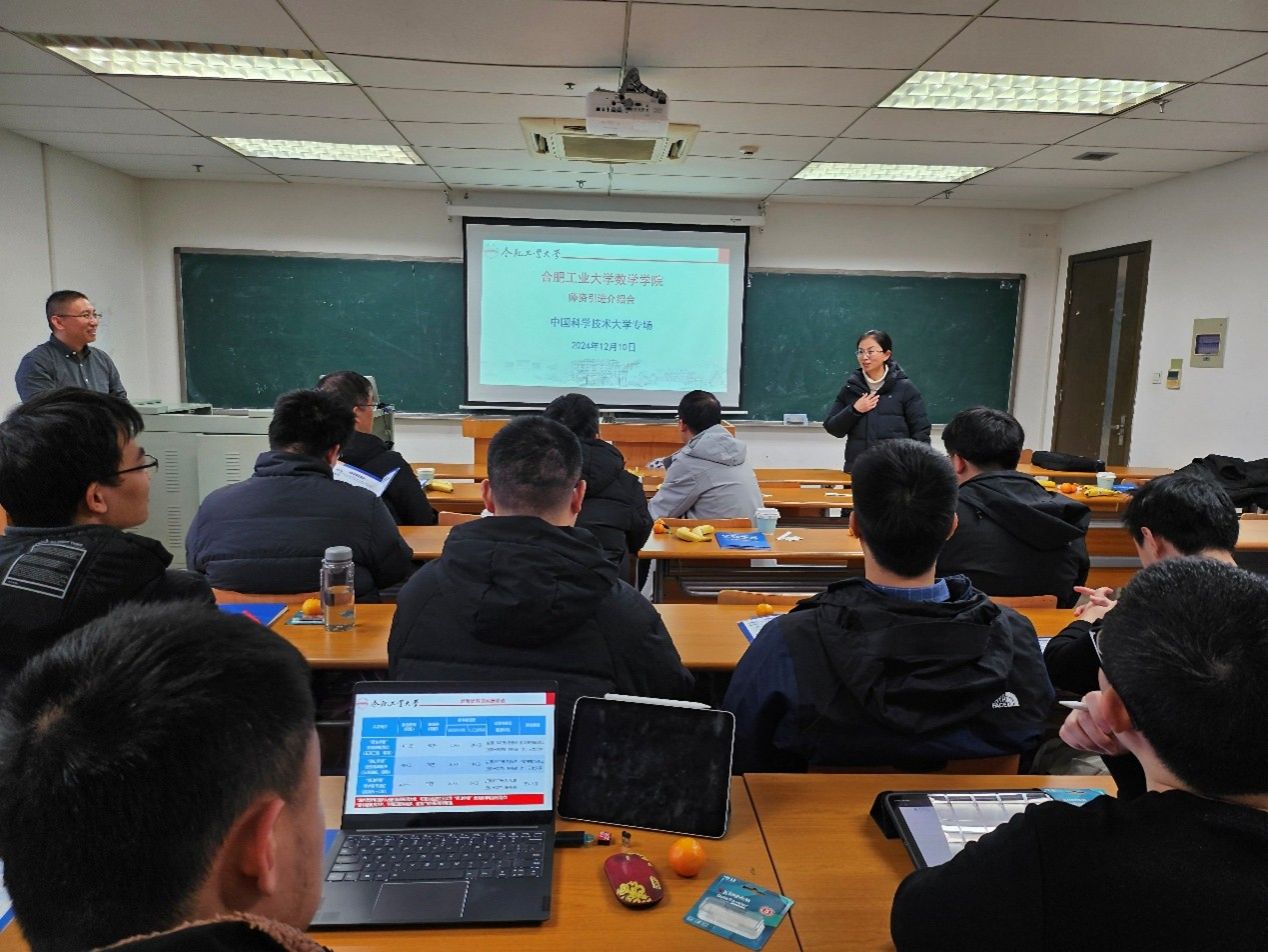 12月10日下午,437ccm必赢国际版党委书记范仁庆、副院长田可雷一行6人赴中国科学技术大学数学科学学院召开专场人才招聘会。中国科学技术大学数学科学学院党委书记左达峰、副院长陈小伍、副书记郑芳、办公室主任黄稚新以及部分特任副研究员、博士后和即将毕业的博士生参加了交流。