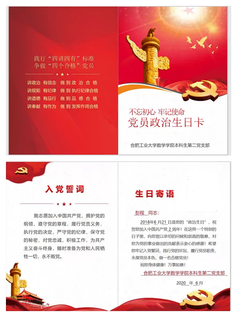 政治生日忆初心。为了让毕业班学生党员铭记党员身份,不忘入党初心,学院本科生党支部为每一位毕业生党员定制了政治生日贺卡、撰写了成长寄语,希望大家毕业后能够奋发向上,不忘入党初心,牢记青年使命,争做新时代优秀党员。