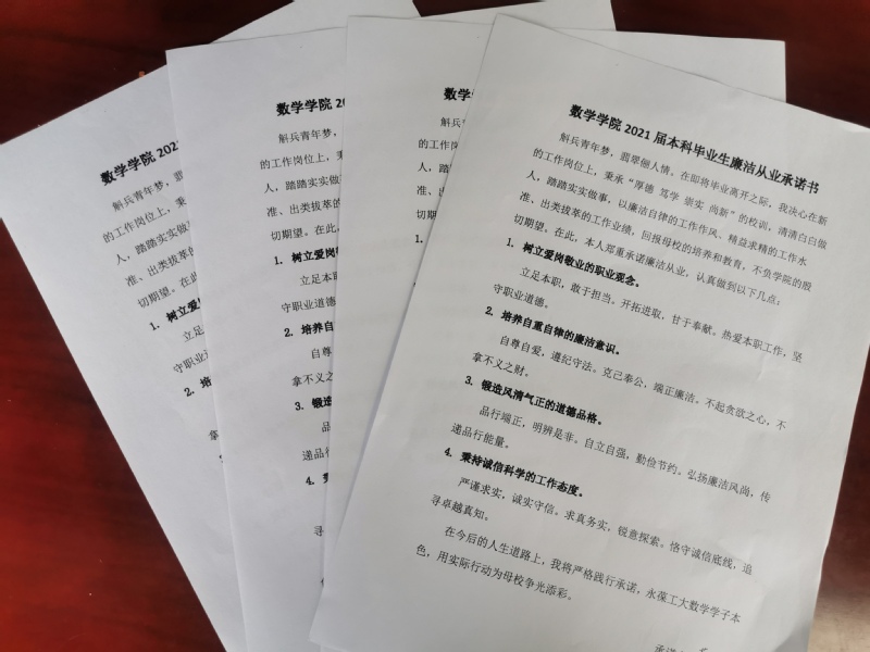 签署廉洁承诺。全体同学在《437ccm必赢国际版2021届本科生廉洁从业承诺书》上郑重签名,并承诺毕业后会树立爱岗敬业的职业观念、培养自重自律的廉洁意识、锻造风清气正的道德品格和秉持诚信科学的工作态度,永葆工大数学学子本色,用实际行动为母校争光添彩。