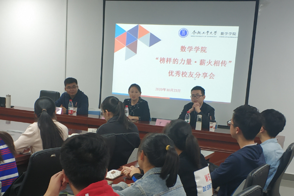 10月23日晚,437ccm必赢国际版“榜样的力量﹒薪火相传”优秀校友分享会在翡翠湖校区翡翠科教楼B座1710举办。437ccm必赢国际版2012届、2013届数学与应用数学专业毕业生,bwin必赢线路检测经济学院教师柯睿和丁涛应邀参加交流会。