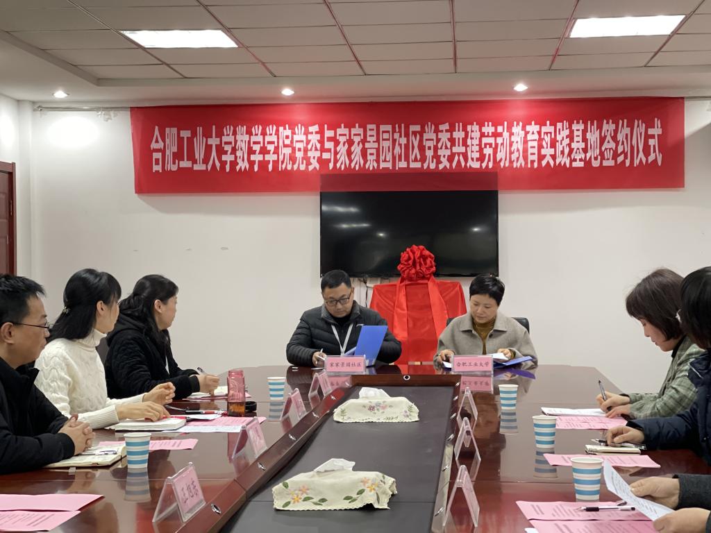 1月6日下午,437ccm必赢国际版与蜀山区家家景园社区共建大学生劳动教育实践基地签约仪式在家家景园社区党群服务中心二楼会议室举行。蜀山区区委、五里墩街道、家家景园社区和学院党委主要负责同志参加仪式。