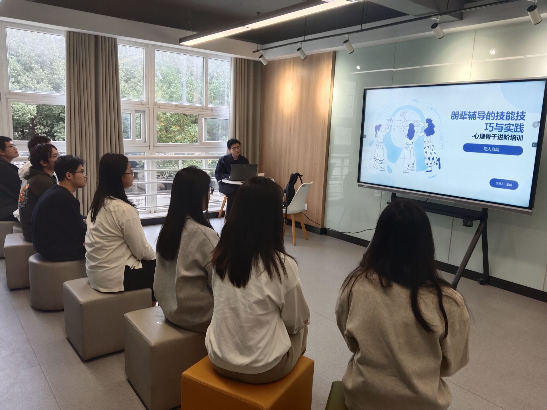 本期斛心沙龙以阅读与朋辈辅导的技能与实践为分享主题。在沙龙的第一阶段,韩老师与同学们交流了阅读中的心得体会,同学们对非暴力沟通的方法非常认同,通过观察、感受、需要和请求四个步骤的学习,对朋辈辅导技能的提升有很大的帮助,因为朋辈辅导也是通过关注他人的需要,建立有爱的联系,从而实现助人自助的目的。